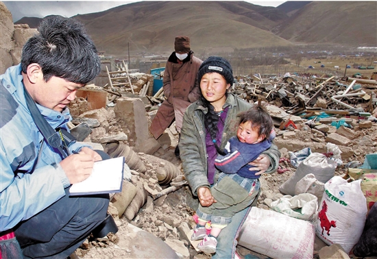 2010年4月底, 浙江日报记者梁臻在玉树地震灾区采访。
