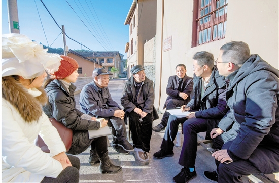 2018年12月21日,浙报集团丽水分社记者施晓义(右二)、郑欣慰(左二)在龙泉市屏南镇寻访红旗渠,找到89岁的村民,听他讲当年的故事。