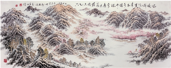 | 画家纪乃连笔下的山水从写生中来,又经过了自己的提炼和升华,将思想、情感和艺术完美地融合在一起,既富于自然气息,又带有深刻的心灵印记。他在设色上讲究温和沉着,在渲染上追求墨与色的统一和谐、虚实相生,苍老与秀润结为一体,单纯与丰富连为一体,给人感觉深厚而大气、明朗而有力、谨严而缜密,使观者用另一种惬意而独特的方式来拥抱美丽的永春山水。 (苏晓晗) 纪乃连 风暖桃源北溪 136cm×68cm |