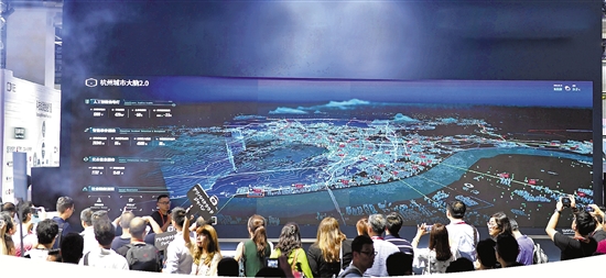 阿里云自研大数据计算平台MaxCompute和城市大脑双双获得浙江省科技进步一等奖。图为2018年杭州云栖大会上推出的城市大脑2.0版。 本报记者 董旭明 摄
