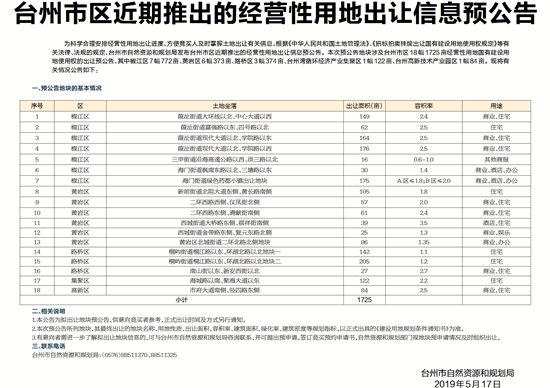 为科学合理安排经营性用地出让进度,方便竞买人及时掌握土地出让有关信息,根据《中华人民共和国土地管理法》、《招标拍卖挂牌出让国有建设用地使用权规定》等有关法律、法规的规定,台州市自然资源和规划局发布台州市区近期推出的经营性用地出让信息预公告。本次预公告地块涉及台州市区18幅1725亩经营性用地国有建设用地使用权的出让预公告,其中椒江区7幅772亩、黄岩区6幅373亩、路桥区3幅374亩、台州湾循环经济产业集聚区1幅122亩、台州高新技术产业园区1幅84亩。现将有关情况公告如下: