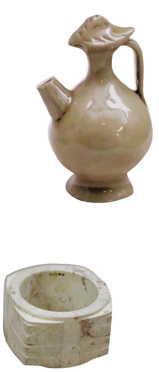 亮相“大美亚细亚——亚洲文明展”的越窑凤头小执壶(上)和良渚玉琮(下)。 本报记者 倪雁强 摄