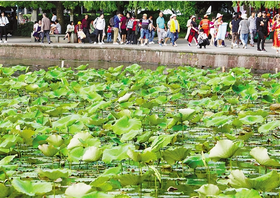 5月21日15时03分,杭州市气象局发布消息称,预计未来5天杭州平均气温均在22℃以上,22日起杭州正式进入气象学意义上的夏季。图为5月21日,杭州西湖一公园荷区已绿意一片。 本报记者 吴煌 摄