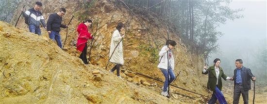 这次“同走新闻路”采访中,记者俞佳友(右一)带队跋涉,探访当年红军在门阵村的练兵场。 本报记者 杨晓轩 李翔 摄