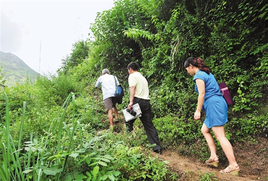 2011年7月18日,记者俞佳友(中)、聂伟霞(后)随老邮递员叶志清,跋山涉水5个多小时才抵达门阵村。(资料图片)