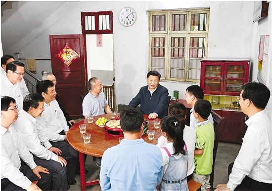 这是习近平在红军烈士后代、退伍军人孙观发家,同孙观发一家和当地镇、村干部拉家常,详细了解老区人民生产发展和生活改善等情况。 新华社记者 谢环驰 摄