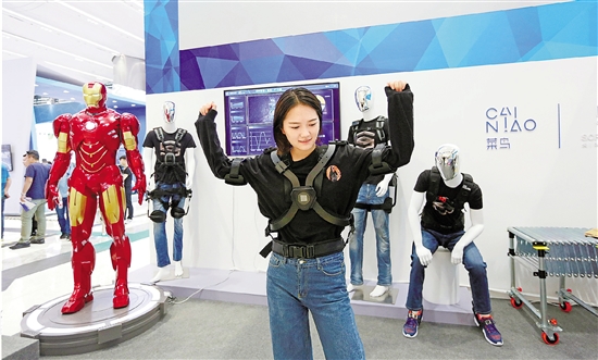 | 5月27日,即将在杭州开幕的2019全球智慧物流峰会展区上,快递飞艇、无人直升机、5G自动驾驶等“黑科技”集体亮相。图为尖叫科技展示的“机械外骨骼”,通过人体仿生学等技术,让快递员瞬间变身“钢铁侠”,轻松搬运重物。 本报记者 魏志阳 摄 |