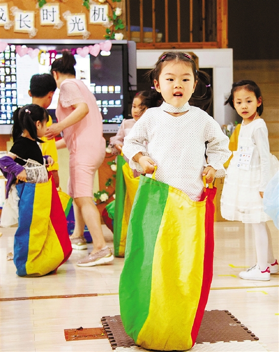 5月31日,杭州市滨江区白金海岸幼儿园春江园区举行“庭院派对”,孩子们手拉手到各个班级串门,参加报纸运球、蒙眼打鼓、穿越火线、袋鼠跳跳跳等游戏。 本报记者 李震宇 摄