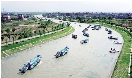 吴兴区蓝藻打捞船队进行打捞作业