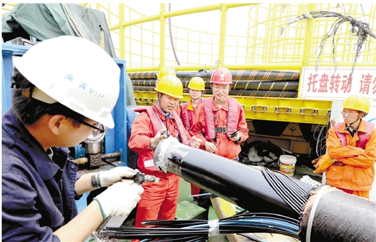 项目总工公言强正在指挥500千伏交联聚乙烯海缆敷设工作 张帆 摄