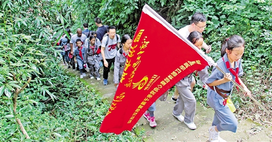 6月28日,温州市凤卧镇举行“游红色胜迹·尝红军粗粮” 活动,70余名青少年身着红军服,重走红军古道。 拍友 兰娇娇 肖乐乐 摄