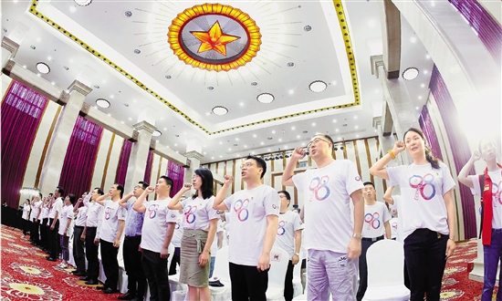 6月29日,杭州市武林商圈的300余名党员代表,在党的生日即将来临之际,齐聚浙江展览馆中央大厅,重温入党誓词,一起聆听党课。