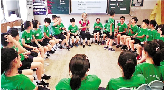 近日,芬兰教育学会派出的14名教师远赴东阳,开展为期一周的教学交流活动。图为7月5日,芬兰老师在东阳市外国语小学进行互动式教学。 东阳日报记者 张耀 黄保平 摄