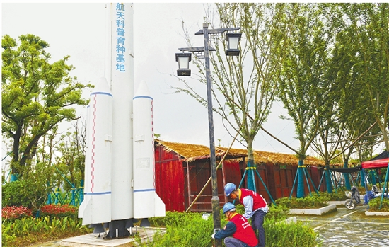 供电员工正在检查航天科普育种基地的路灯等基础用电设施 沈文文 摄