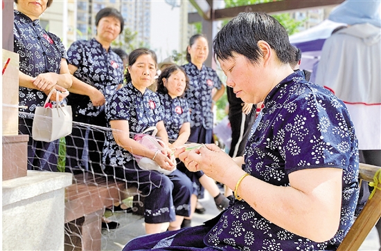 为了充分挖掘渔文化,7月17日,绍兴市越城区东湖街道举办了东湖水乡文体节织网比赛,选手们飞针引线,不一会儿一片片渔网就初具模样,吸引不少群众驻足观看。 本报记者 郑培庚 拍友 傅彬彬 摄