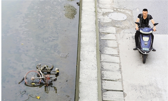 在杭州市萧山区北塘路,一辆共享单车被随意丢弃在河道中,一名路人骑着电动车从边上经过。