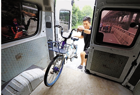 孙天民将“拯救”出来的共享单车搬上汽车,运回公司仓库检修。