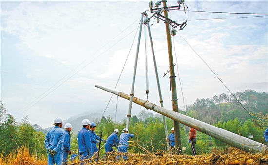7月22日,国网临海市供电公司括苍供电所在岩坑村进行电杆架设工作。谢宗耀 摄