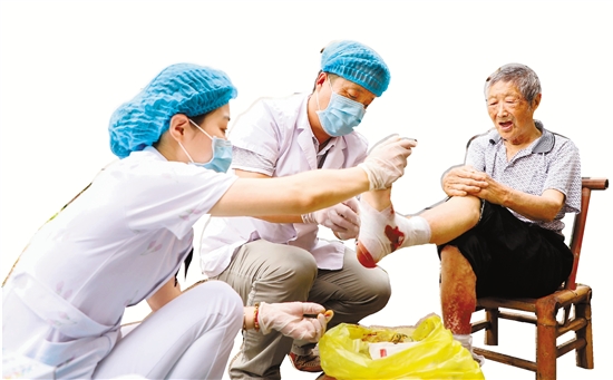 万少华(中)为魏洪福换药。记者 钱洁瑗 摄