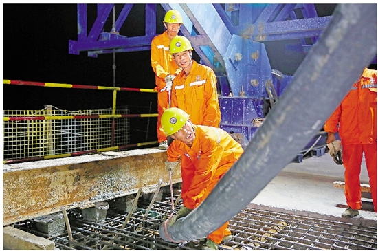 右图为当日,中国中铁八局建设者向最后一个合龙节段浇筑混凝土,进行大桥合龙工作。 新华社发