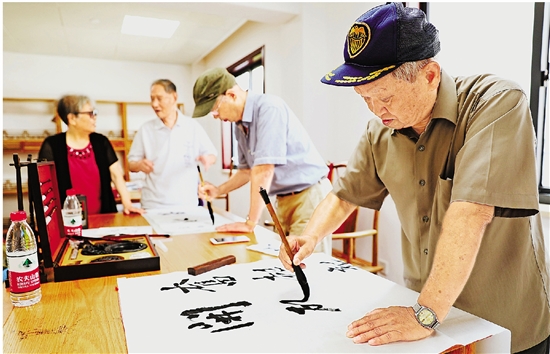 舟山市定海区居家养老综合服务中心内,老人们正在参加书法活动。(资料照片)