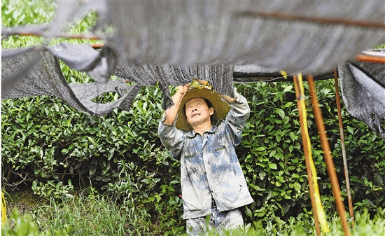 7月28日,杭州骄阳似火,在龙坞茶镇龙井茶园,何家村村民开始搭遮阳篷,使龙井茶树免受太阳炙烤。