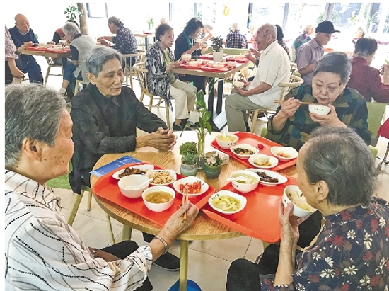 老人们在翠苑一区老年食堂中用餐。