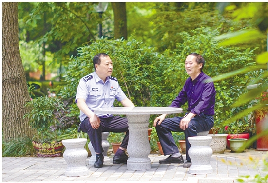 社区民警华仲虎在小区内和群众交流沟通,征集智安小区建设中的需求。 (图片由杭州市公安局富阳区分局提供)