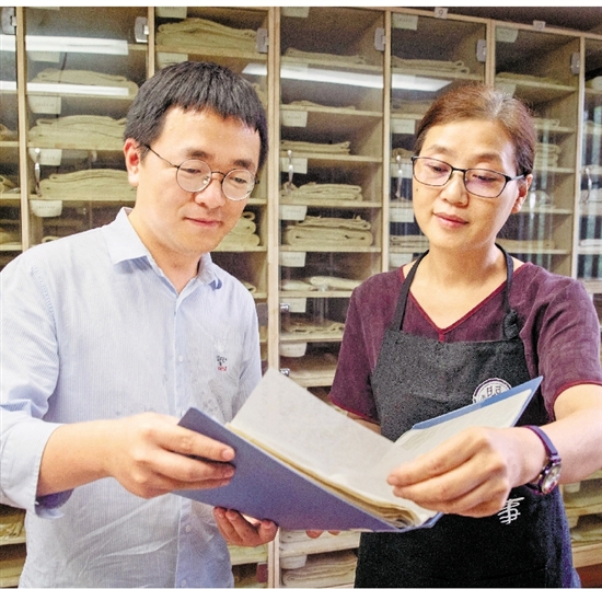 王金玉(右)指导记者为古书修复选择合适的纸张。