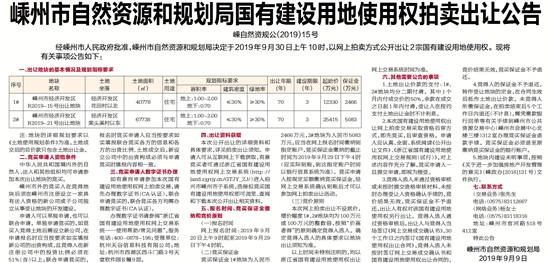 经嵊州市人民政府批准,嵊州市自然资源和规划局决定于2019年9月30日上午10时,以网上拍卖方式公开出让2宗国有建设用地使用权。现将有关事项公告如下: