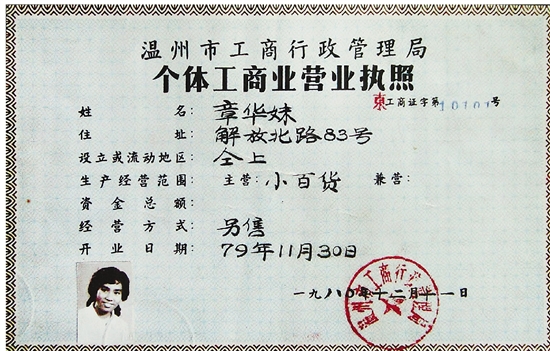1980年,温州的章华妹领到了第一张个体工商户营业执照。