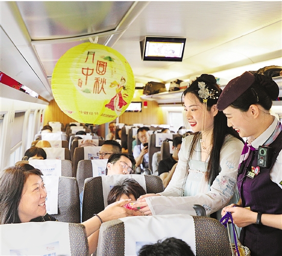 9月13日,西子号列车员装扮成“嫦娥”,在杭州开往北京的G20次列车上为旅客送上月饼和中秋祝福。 本报记者 王建龙 王嘉楠 摄