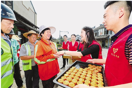 德清县下渚湖街道开展“中秋献爱心、情系环卫工”活动,党员志愿者和爱心人士为30多位环卫工人送上月饼、水果等节日礼物,感谢他们的辛勤付出。 拍友 王正 许俊俊 摄