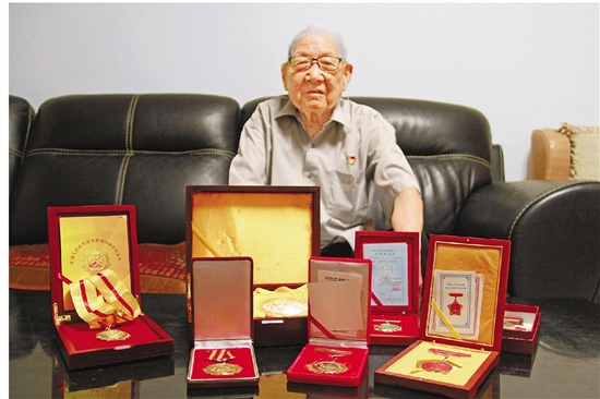 胡兆富和他获得的军功章。 本报记者 叶晓倩 摄