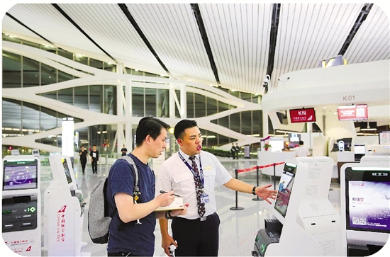 记者陈伟斌(左)在大兴机场采访。本报记者 李翔 摄