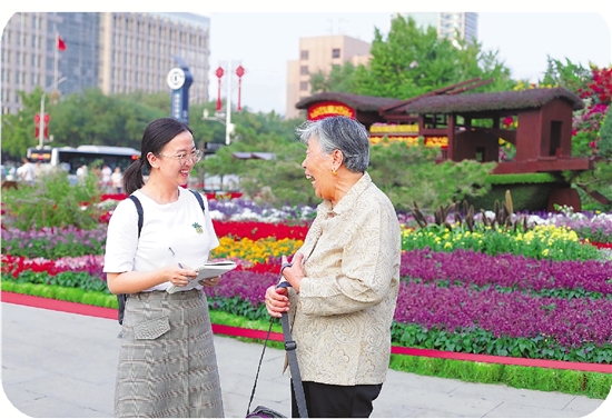 记者沈晶晶(左)在花坛前采访。本报记者 李翔 张孙超 摄