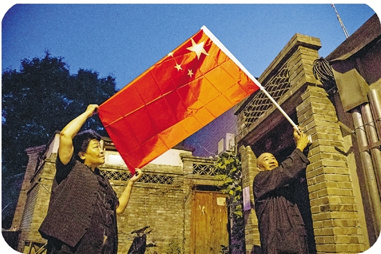 谢玉琴与老伴在挂国旗。 记者 李震宇 王建龙 摄