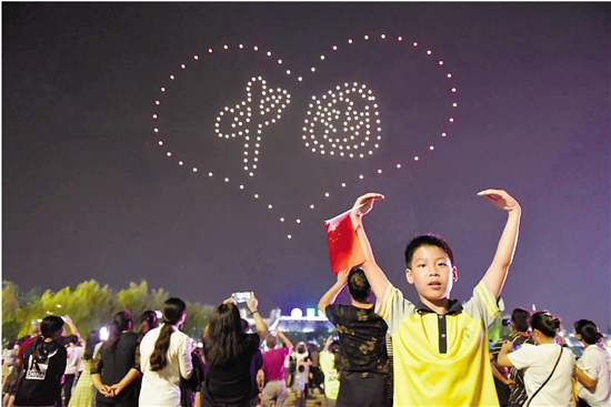 9月30日晚,嘉善西塘古镇景区200架无人机组成“中国”字样和爱心形状。
