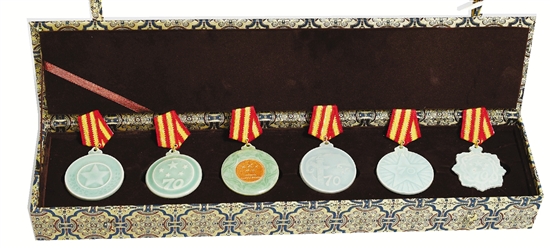 9月30日,龙泉剑瓷艺人展示携手创作的徽章。