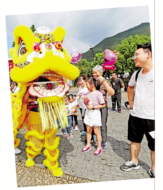10月2日,杭州富阳龙门古镇,游客观看各式民间杂技。国庆期间,古镇举办龙门庙会,不仅有各种非遗体验展示,还特聘由国家级大师领衔的杂技团队表演变脸等技艺。