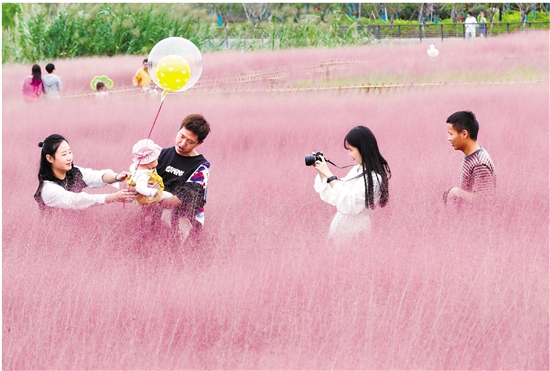 10月6日,德清县乾元镇联合村东苕溪边大片粉黛乱子草绚丽绽放,吸引众多游客前来观赏游玩。 拍友 王正 摄