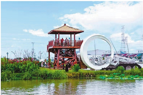 寒露将近,绍兴市越城区陶堰镇泾口村烟波浩渺,绿叶红花。这个3A景区生态精品村在国庆假期正式开门迎客,吸引了杭州、台州等地的众多游客前来打卡。图为游客登高欣赏秋色。 拍友 金舒曼 摄