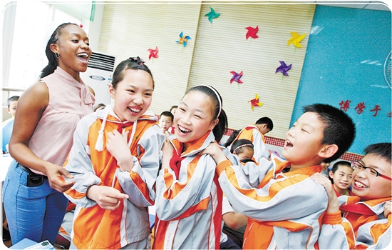 杭州市滨江第一小学的学生参加外教快乐英语大篷车活动
