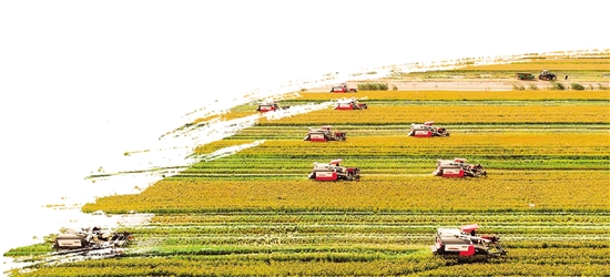 浙江慈溪现代农业产业园盐碱地水稻收割