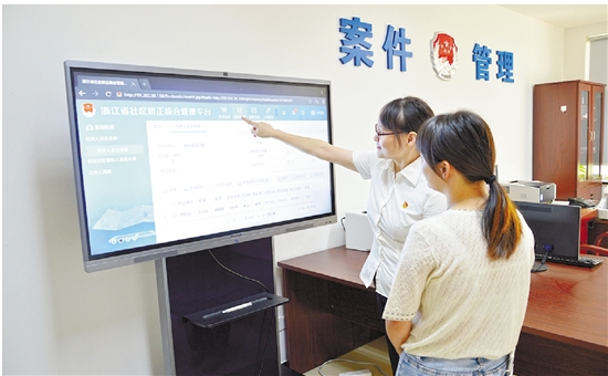 案管室工作人员正在查询电子档案 (图片由余杭区社区矫正中心提供)