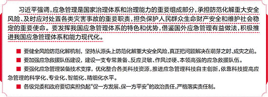 习近平强调,应急管理是国家治理体系和治理能力的重要组成部分,承担防范化解重大安全风险、及时应对处置各类灾害事故的重要职责,担负保护人民群众生命财产安全和维护社会稳定的重要使命。要发挥我国应急管理体系的特色和优势,借鉴国外应急管理有益做法,积极推进我国应急管理体系和能力现代化。