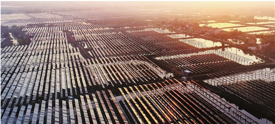 | 12月9日,湖州市南浔区和孚镇40多万块太阳能电池板密布在4200多亩桑基鱼塘上。目前,该渔光互补项目年发电量超过2亿千瓦时,可以满足10万户家庭一年的用电量,相当于节约标准煤6.4万吨。 本报记者 董旭明 拍友 谢尚国 摄 |