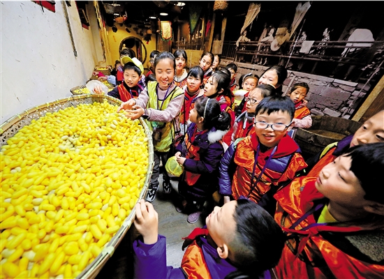 桑基鱼塘小传人卢妍欣(身穿马甲)向同龄人讲述湖州丝绸文化的历史变迁。