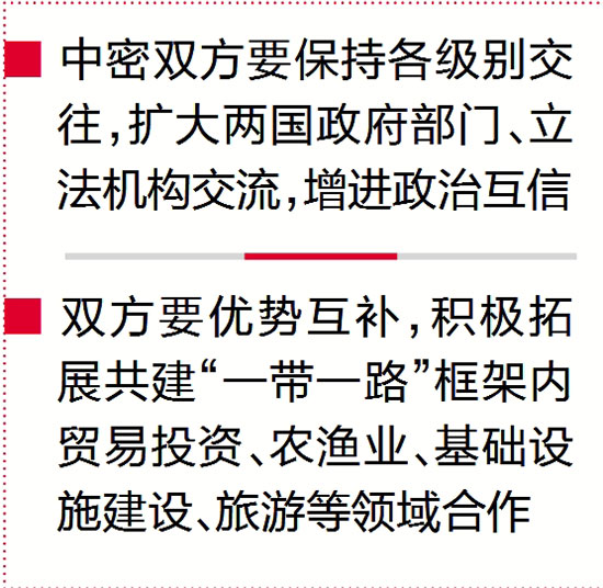 ■ 中密双方要保持各级别交往,扩大两国政府部门、立法机构交流,增进政治互信