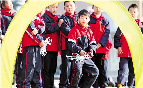 12月12日,德清县三合中心学校操场上,学生们正在操作无人机穿越拱门。近年来,德清县教育部门开设选修科技课,让学生们亲近科学,激发创新创造意识、培养科学探索精神。